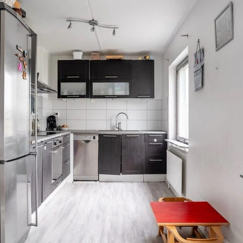Köksinredning från Myresjökök (Marbodal) med en interiör med förvaring bakom spraymålade luckor. Bänkskiva i ljusgrå laminat. Diskmaskin från Siemens från 2018, Inbyggd mikrovågsugn från Siemens, spishäll från Siemens, inbyggd ugn från Siemens och fläkt.