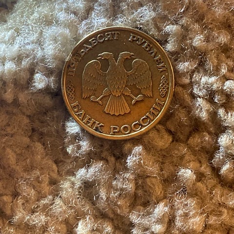 Ryssland mynt 1 rubel och 20 rubel 1992. Båda mynten är från Bank Rossii och visar dubbelhövdad örn på ena sidan samt valör, årtal 1992 och växtmotiv på den andra sidan. Mynten är runda med räfflad kant. Lämpliga för samlare av ryska mynt eller som referensobjekt för numismatik.