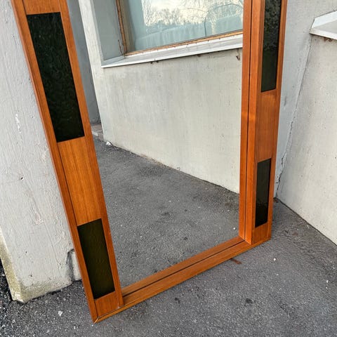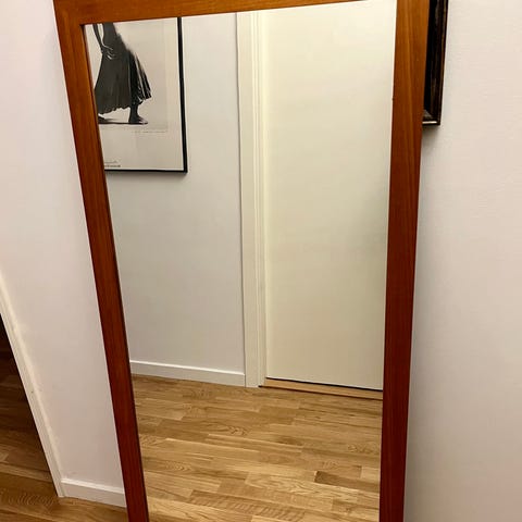 Väggspegel i teak Scandinavian design och retro 1950- och 60-talet. Denna typ av spegel kännetecknas av sin enkla elegans, varma trätoner och tidlösa formgivning.