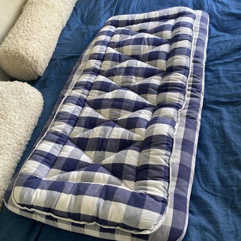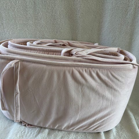 Spjälskydd utformat som en orm i blåa och gröna nyanser. Passar till spjälsäng.