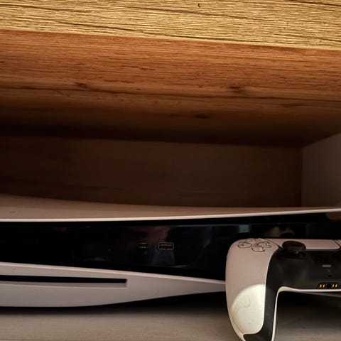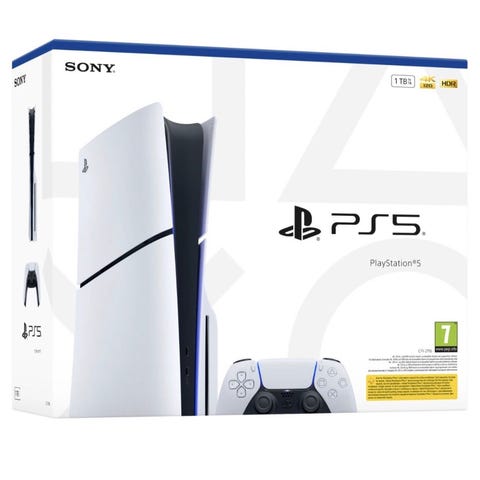 Sony Playstation 5 spelkonsol i vit färg. Stationär konsol med skivläsare framtill. På bilderna syns även ett par vita trådbundna hörlurar och en handkontroll. Konsolen är avsedd för tv- och datorskärm via HDMI-anslutning samt nätverksanslutning för onlinespel och nedladdning av spel och media.