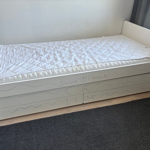 IKEA säng med madrass i vit och grå färg. Sängen består av en resårbotten med ben och en övermadrass. Övermadrassen är vit med quiltat mönster och ligger ovanpå en grå madrassdel. Passar som enkel säng i sovrum eller gästrum. Material är textilklädsel med stoppning i madrassen för liggkomfort.