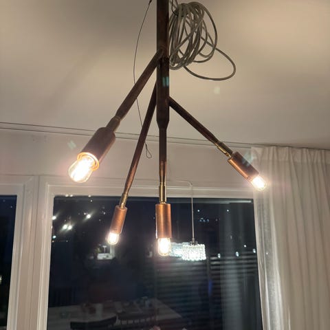 Modern LED-pendellampa med “stickor”/rör i korsform, matt mässingslook. Säljes pga flytt.