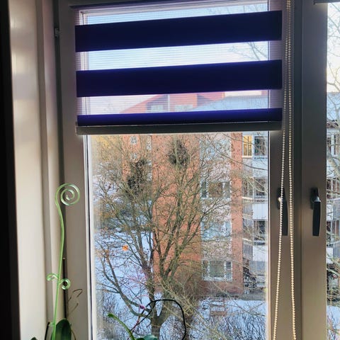 Mio 2 stycken rullgardin i randigt ljusbrunt tyg med vågformat dekorband och hängande dekordetaljer längst ned. Modellen är en så kallad dag- och natt-rullgardin med dubbla tygskikt som kan justeras för att reglera ljusinsläpp och insyn. Passar för montering i fönster som på bilderna, exempelvis i kök eller vardagsrum. Materialet är textil med horisontella ränder i olika bruna nyanser. Gardinen manövreras med dragmekanism i sidan (ej tydligt synlig på alla bilder). Lämlig för inomhusbruk i bostadsmiljö.