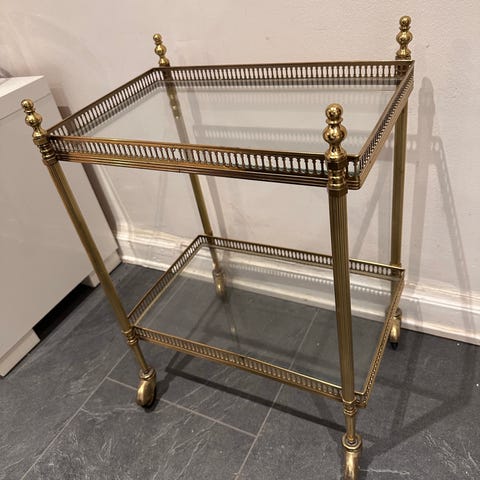 Serveringsvagn i metall med guldfärgad stomme och två hyllplan i glas. Vagnen har två större hjul baktill och två mindre hjul framtill för enkel förflyttning. Övre hyllplanet är inramat med kantlist och ena sidan har handtag för att kunna skjuta vagnen. Passar för servering eller förvaring av exempelvis glas, flaskor eller dekorationer i vardagsrum, matsal eller kök.