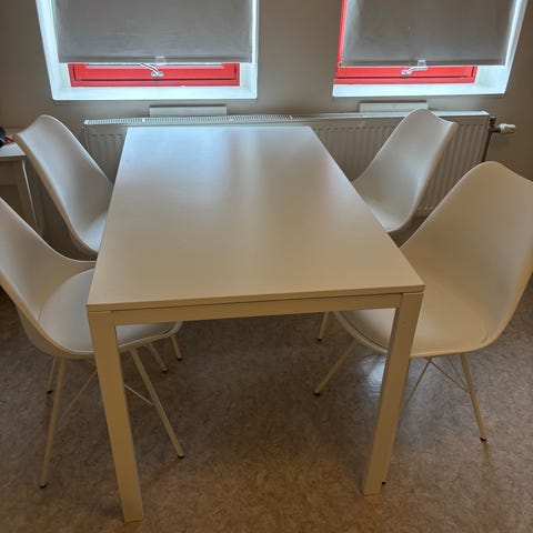 matbord rektangulär glasskiva. Bordet har svart underrede med tvärslå och står på fyra ben. Glasskivan är genomskinlig och täcks här av en lös duk eller skydd, vilket kan tas bort vid behov. Bordet är anpassat för flera sittplatser och kan användas som matbord i kök eller vardagsrum.