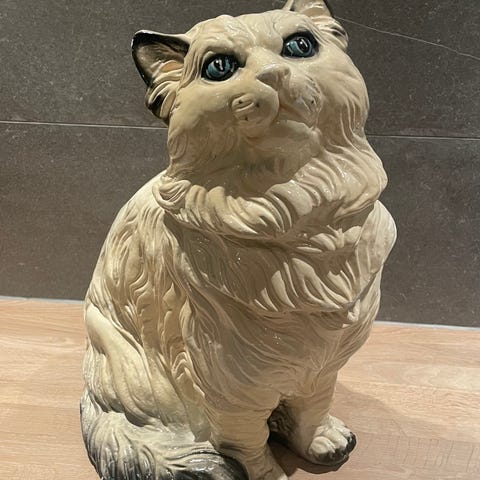 Sea Glasbruk, Renate Stock Paulsson, katt i blått glas med handmålad dekor. Triangulär form, höjd 15 cm, bottenlängd 7 cm, vikt ca 550 gram. Etikettmärkt och felfri. Passar som prydnadsföremål i hemmet eller som samlarobjekt för glasfigurer och kattmotiv. Kan skickas med PostNord