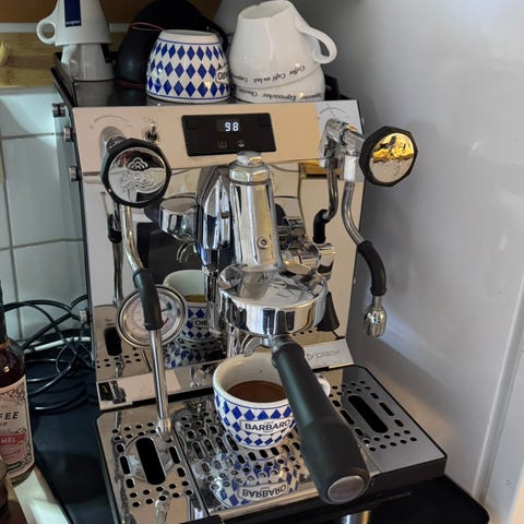 Rocket Espresso espressomaskin med flera baristatillbehör. Rocket appartamento 2.0 vit med Rocket Faustino chrome. Knockbox Rocket, espressovåg, kaffefördelare, kaffeutjämnare, 2 tampers, flera filterkorgar med bättre kvalité än original. Uppgraderad spridare. Original medföljer. 3 handtag ett naket. Stålfilter. Vakumförvarare för kaffe och 2 rostfria kannor följer med. 2 x6 koppar med fat. Nypris maskin 17000:- på rea idag. Kvarn 8500:-. Skickas inte.