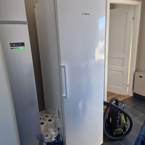 Kyl, ca 60x60x185 cm. Handtag precis utbytt. Inga skador vad jag kan se på framsida, endast skav på vänster långsida, se bild. 500kr.