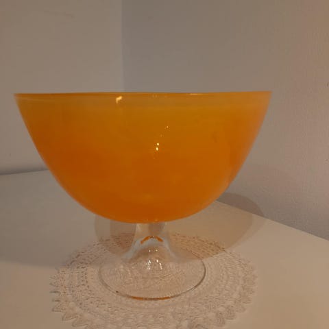 Konstglas, handgjord och dekorativ av Cilla Persson för Nybro Glasbruk. Höjd 9,5 cm ø ca 14,5 cm, vikt ca 600 gram. Felfri. Obs inte så citrongul som bilderna visar. Den är mer lik färgen på sista bilden, lånad bild.