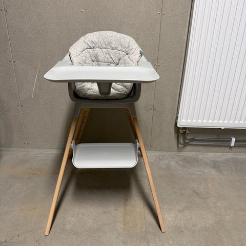 Ljusgrå Tripp Trapp matstol från Stokke. Tillverkningsår 2019. Lite av färgen har skavts av från några ställen, annars i fint skick.