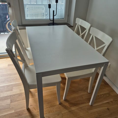 Ikea Bjursta bord med 2 iläggsskivor så bordet blir från 175 cm till 260,små skador, 6 Ingolf stolar med svarta dynor, 1 stol lite defekt.