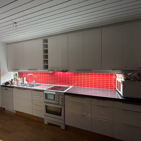 Kök från Köksmakarna i Borås, troligen installerat 1987 men välbevarat. Luckorna omlackade på senare tid och uppfattas som överlag som fräscha om än med något mindre skrapmärke.