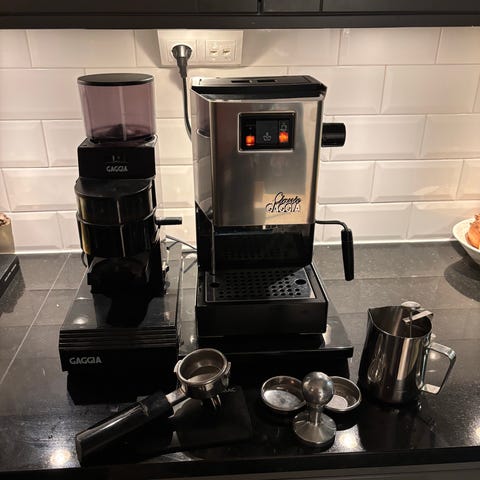 Gaggia Classic espressomaskin i rostfritt stål. Uppgraderad med bättre mjölkskummare. Bryggruppen packades om för något år sedan av Coffeeema i Göteborg och då sänktes även trycket till 10 bar (står högre från fabrik och då blir det sämre crema). Kaffekvarn Dualit EL60 som är justerad för att i finaste läget kunna mala något finare än original, vilket är lämpligt för vissa bönor.