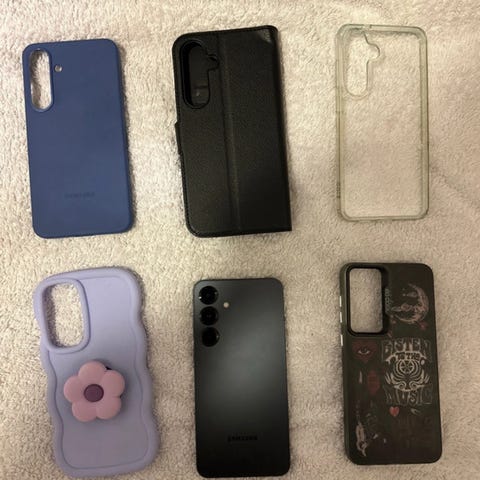 Samsung Galaxy S23 mobiltelefon med 256 GB lagringsutrymme. Färg: vit. Pekskärm över hela framsidan och trippelkamera på baksidan. USB‑C-kabel ingår enligt bild. Flera mobilskal visas på bilderna, inklusive genomskinliga skal och skal med magnetring, som kan användas som skydd och för att underlätta grepp och fäste mot kompatibla tillbehör. Passar för vardaglig användning, surf, appar, foto och video med gott om lagringsutrymme för filer och media.