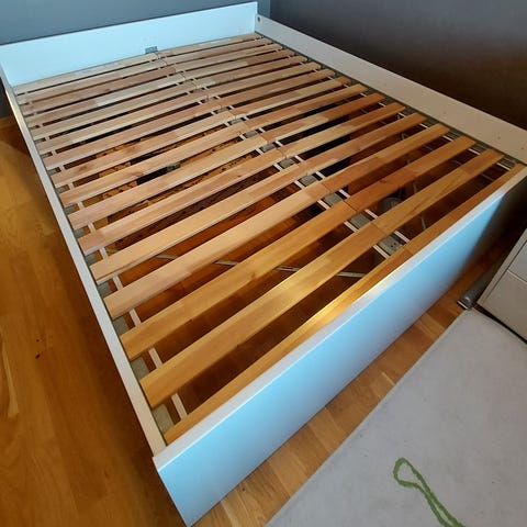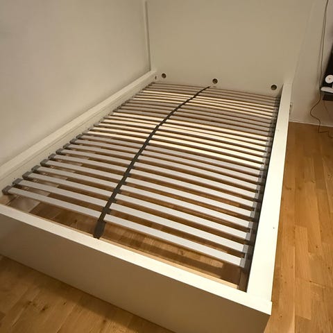 IKEA sängram i vit färg. Mått enligt bild: längd ca 209 cm och bredd ca 196 cm. Huvudgaveln är högre än fotgaveln och sängramen har metallbalkar och stag för stabilitet. Passar dubbelsäng med motsvarande madrassmått. Sänglådor på hjul i vit färg ingår enligt bild och ger extra förvaringsutrymme under sängen.