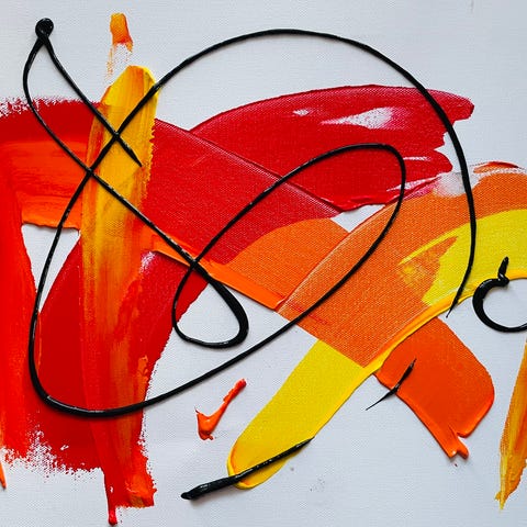 Abstrakt konstverk Motivet består av expressiva, svepande linjer i gult ovanpå en strukturerad bakgrund i flera färger. Tavlan är kvadratisk och visas här med en vit passepartout och svart ram, vilket ger en tydlig inramning av motivet. Passar som väggdekoration i till exempel vardagsrum, sovrum eller kontor. Säljes utan ram.
