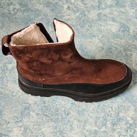 Nubuckläder. Mycket slitstarkt. Använda 2 ggr. Har man en gjuten sula så får den plats i skon Nypris 2100 kr Köpte fel storlek.