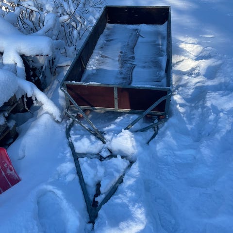 Luftfjädrad skoterpulka som blivit väldigt lite använd av oss då barnen hellre åkte på skotern. Årsmodell 2022, kapellet är solblekt som det brukar va på dessa pulkor.