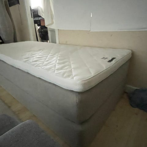 IKEA säng med resårbotten i grått tyg. Överdel med ljus madrass/toppmadrass med knappquiltning. Träram med ben och vit underdel. Passar som enkel säng i sovrum eller gästrum.