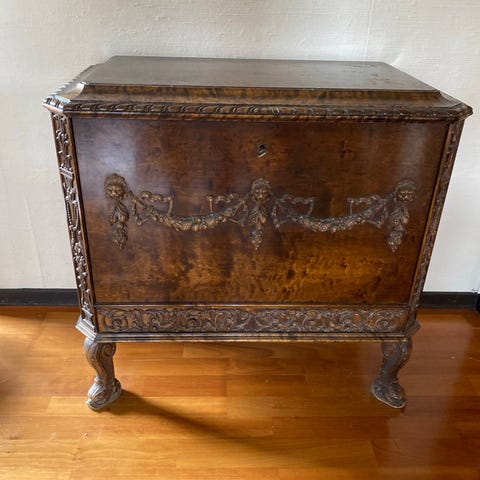 Invändigt i fint skick och stabil konstruktion. Normalt bruksslitage finns utvändigt efter ålder — bidrar till den charmiga vintagekänslan.