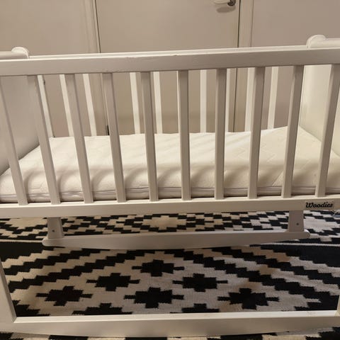 Troll bedside crib spjälsäng i vitlackat trä - fint använt skick. Madrass, lakan, spjälskydd och sängmobil ingår om man vill ha det. Hämtas i Nacka. Kan ej hjälpa till att bära eller lasta sängen dagtid (finns i villa på botttenvåning).