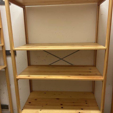 Trähylla med flera hyllplan i naturfärgat trä. Hyllan har öppna, ribbade hyllplan som ger god ventilation och överblick över innehållet. Passar för förvaring av till exempel böcker, korgar, skor eller annan förvaring i vardagsrum, hall, förråd eller klädkammare. Enkel, rak design som är lätt att placera mot vägg eller i ett hörn.