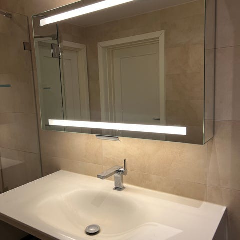 Vägglampa för badrum med två ljuskällor. Lampan har väggfäste och armatur i kromfärgad metall samt två vita, koniska glasskärmar som ger ett mjukt och riktat ljus. Passar över spegel eller som allmänbelysning i badrum eller andra våtutrymmen där väggmonterad belysning önskas.
