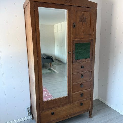 Garderob i trä med stor spegeldörr på framsidan. Skåpet står på ben och har en klassisk, rak design. Träytan har en varm brun ton. Passar för förvaring av kläder och andra textilier i sovrum eller hall. Invändig inredning framgår inte tydligt av bilden.