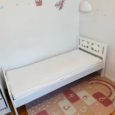 IKEA Kritter juniorsäng i vitlackat trä. Sängen har dekorativa fårmotiv i gavlarna.
