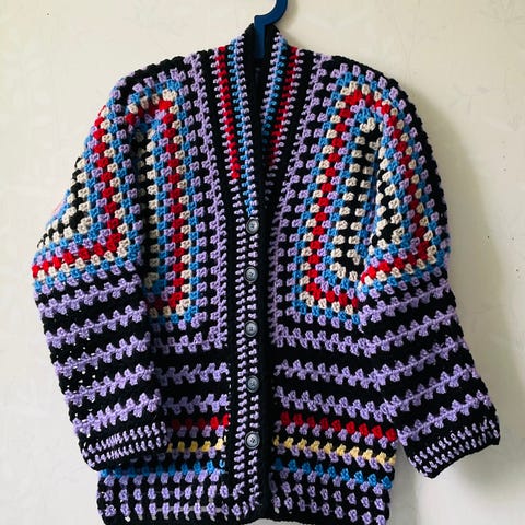 Helt ny och aldrig handvirkad tröja. Alla mina virkade tröjor finns endast i ett exemplar. Virkade efter eget påhittat mönster. Storlekar ca 38-42. PS jag har ca 20 st nyvirkad tröjor till försäljning som också är handvirkade och aldrig använda i olika mönster, storlekar och priser.