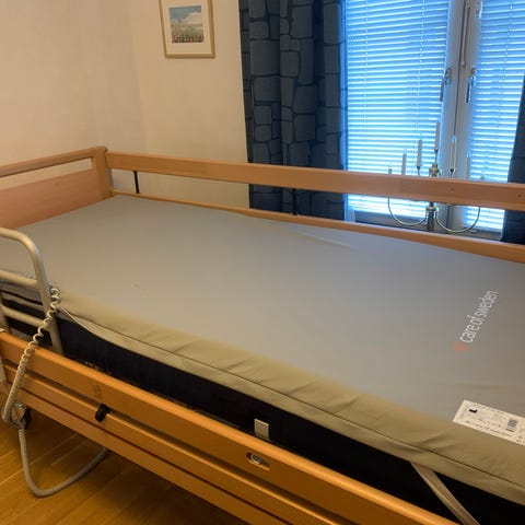 Höj- och sänkbar vårdsäng inkl madrass. Inköpt 2022 och endast använd en gång i utbildningssyfte. Säljes p g a flytt. Inköpspris 26 500 kr.