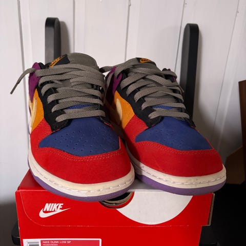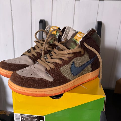 Nike sneakers i storlek 42. Modellen är en högre sneaker med snörning. Skorna är brun- och gråfärgade med svart sula och svart Nike-logga på sidan. Ovandel i kombination av textil och syntet/läderliknande material. Passar som vardagssko eller fritidssko.