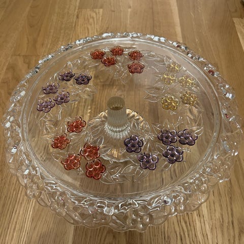 Vacker waltherglas skål på fot , frostat glas med rosa blommor, vintage, 16 cm i diameter, 10 cm höjd.