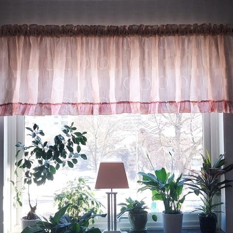 Handvirkat gardin kappa i en ljus nyans med ett detaljerat mönster med vågiga kanter nedtill, vilket ger en dekorativ touch virkat med svensk tråd från Mölnlycke.Mönstret består av en kombination av täta och glesare virkade partier som bildar ett intrikat design. Den är lämplig för att dekorera fönster eller en möbel. Mått 200 cm* 94 cm.