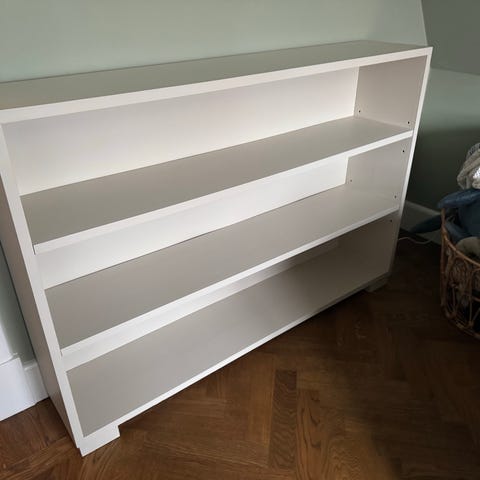Vanlig Billybokhylla med 6 lösa hyllor. Ligger på golvet på bilden eftersom den är flyttad från ett annat rum och jag inte orkar lyfta upp den.