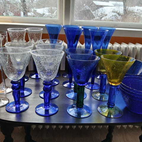 Uranglas och manganglas, lyser under uv lampa. Glaset är uran, men bara halva typ så gissar att det är doppat i uran. Bör ej drickas ur. 2 skador på burken med lock. Rost på locket på lilla kannan.