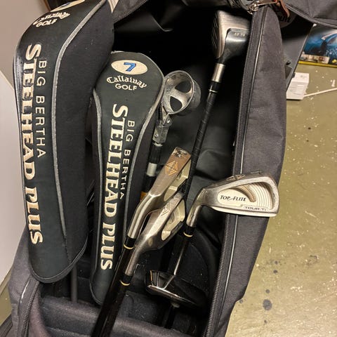 Bra nybörjarset med järnklubbor 5-9. P och G klubba. En hybrid och en putter. Golfbagen kan inte stå rakt. Hämtas i Växjö