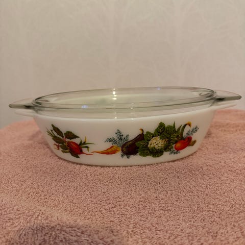 Säljer en retro ugnsform med glaslock från serien L’Echalote La Marjolaine. Klassisk 70/80-talsdesign med dekor av grönsaker och örter.
