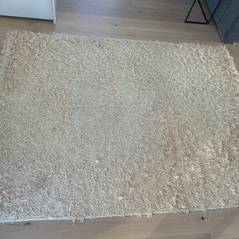 Matta med fransar i cremevit / beige färg. Mått: 160×230cm. I nyskick.