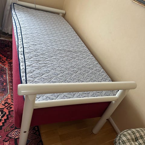 Enkel säng med mått cirka 90x200 cm. Blå resår- eller ramsäng med tygklädsel och raka träben. Passar som enkelsäng i sovrum, gästrum eller tonårsrum. Madrass och stomme är integrerade i samma del, och sängen står direkt på ben utan sängram runtom.