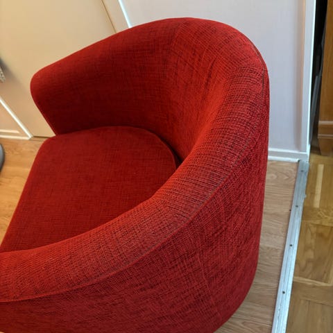 Röda fåtöljer. Ena är mer slitet i tyget, så kan behöva lite kärlek. Hämtas i Halmstad, kan även levereras emot en liten peng.