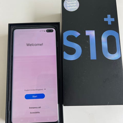 Samsung Galaxy S10 mobiltelefon i svart färg. Pekskärm på framsidan och trippelkamera med blixt på baksidan. Flera utbytbara skal med olika mönster och färger ingår, vilket ger extra skydd och möjlighet att variera utseendet. Lämplig för vardaglig användning som samtal, meddelanden, surf och appar.