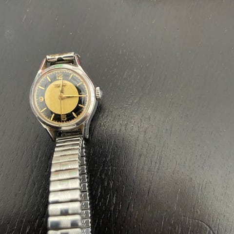 Tissot armbandsur för kvinna med metallfärgat armband och rund urtavla. Klockan har klassisk analog visning med tim-, minut- och sekundvisare. Boett och armband är i metall med elastiskt länkarmband. Passar som vardagsklocka eller enklare dressklocka. Exakta mått, modellnamn och urverkstyp är inte angivna. Behövs nytt batteri. Obs! Skickas inte