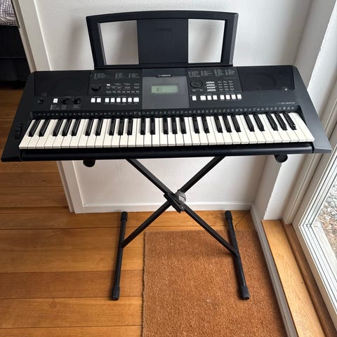Säljer ett Yamaha PSR-E443 med stativ, oanvända stereo hörlurar och ström adapter.