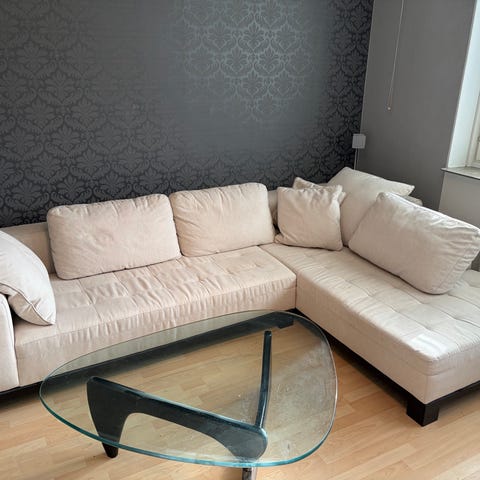 Vit L-soffa i äkta skinn + vitt matbord med 4 stolar