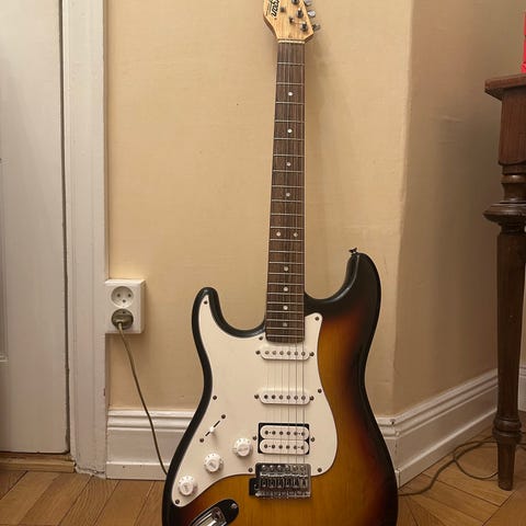 – En Fender Squier Stratocaster-liknande elgitarr i sunburst-finish med vit plektrumskydd. Gitarren har tre single-coil-mikrofoner, volym- och tonkontroller samt 5-lägesswitch. Greppbräda i mörkt trä och lönnhals.