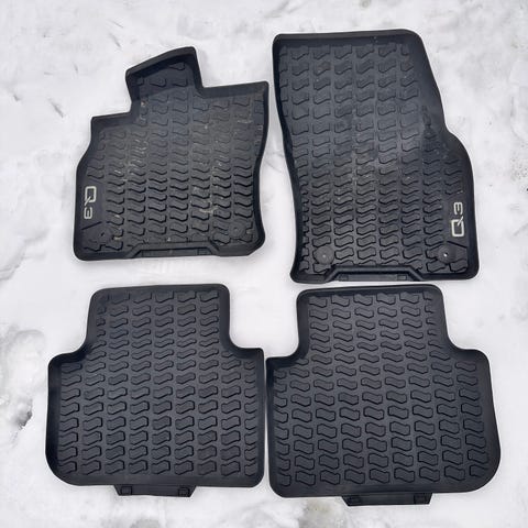 Svarta gummimattor för bil. Setet består av en bagagerumsmatta och alla 4 golvmattor för kupén. Mattorna är formade för att täcka golvytorna och skydda mot smuts och väta. Har haft dom i en 2019.