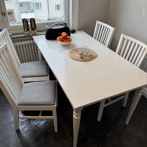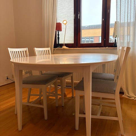 Runt köksbord som går att förlänga,med ca. 55cm,så det finns plats för 6 personer,det följer med 4 stolar.
