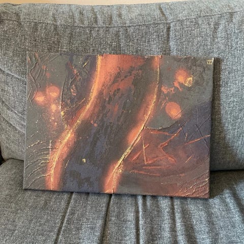 Spackeltavla i abstrakt motiv med detaljer i guld. 40x40cm